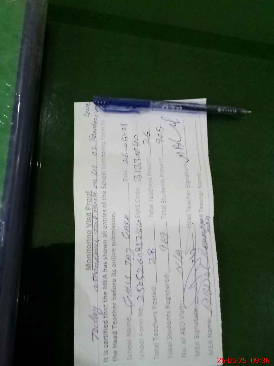 | Attendance Register | Head Teacher | MEA with School | Visit Proof |