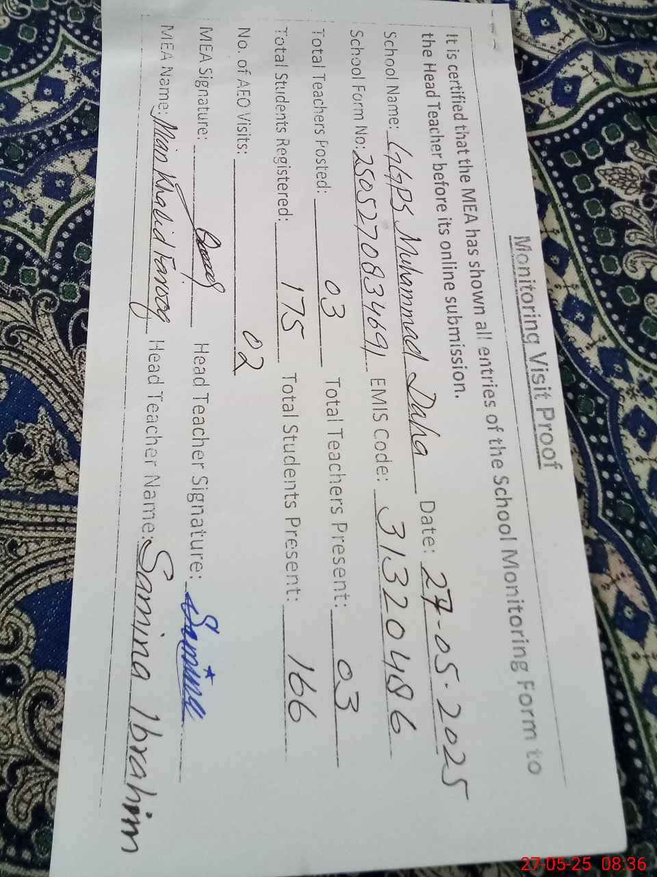 | Attendance Register | Head Teacher | MEA with School | Visit Proof |