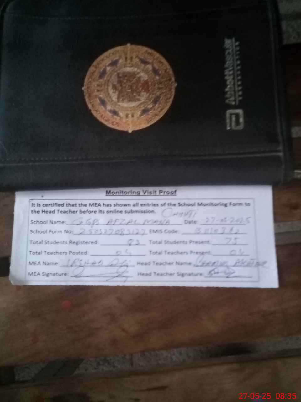 | Attendance Register | Head Teacher | MEA with School | Visit Proof |