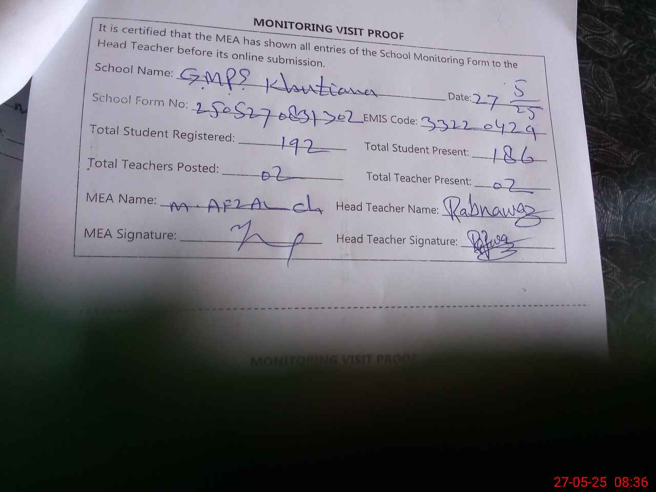 | Attendance Register | Head Teacher | MEA with School | Visit Proof |