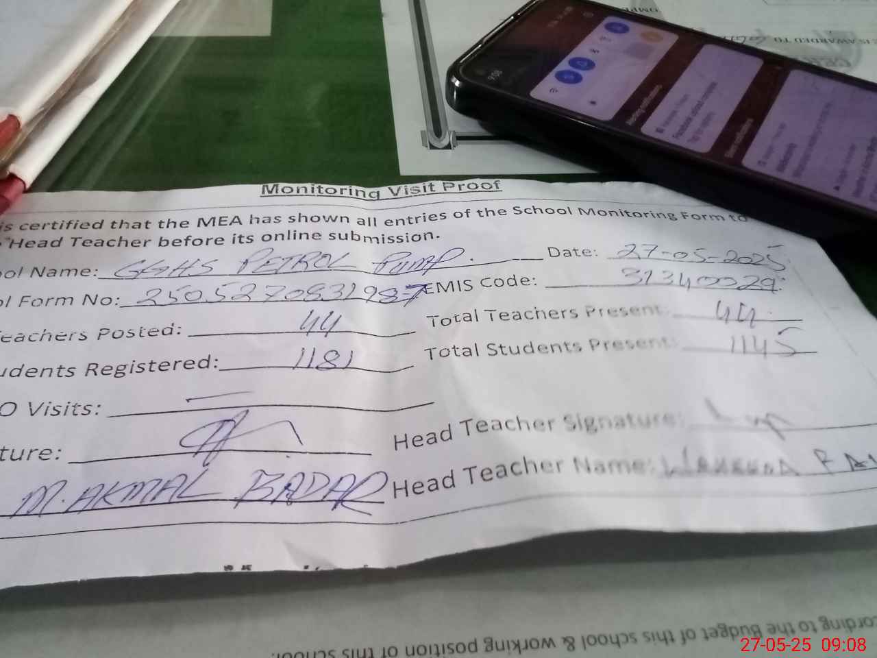 | Attendance Register | Head Teacher | MEA with School | Visit Proof |