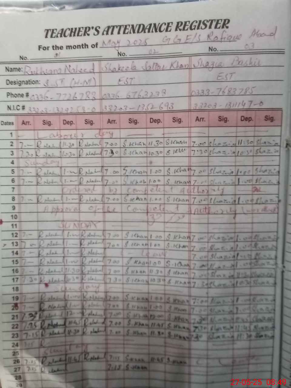| CNIC | Full Name | Designation | R/C | Absence During Last Calender Month |