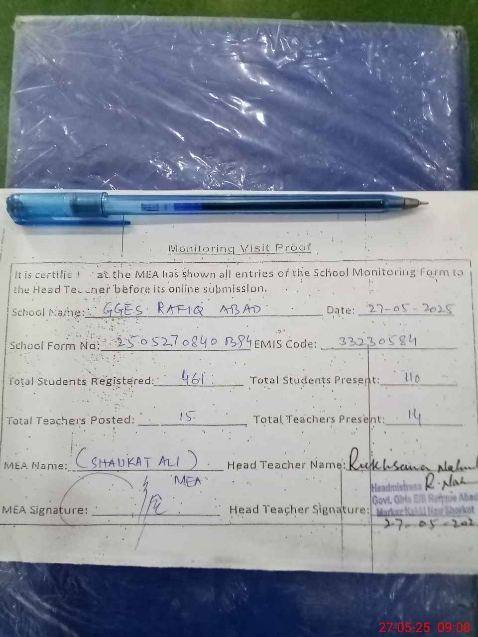 | Attendance Register | Head Teacher | MEA with School | Visit Proof |