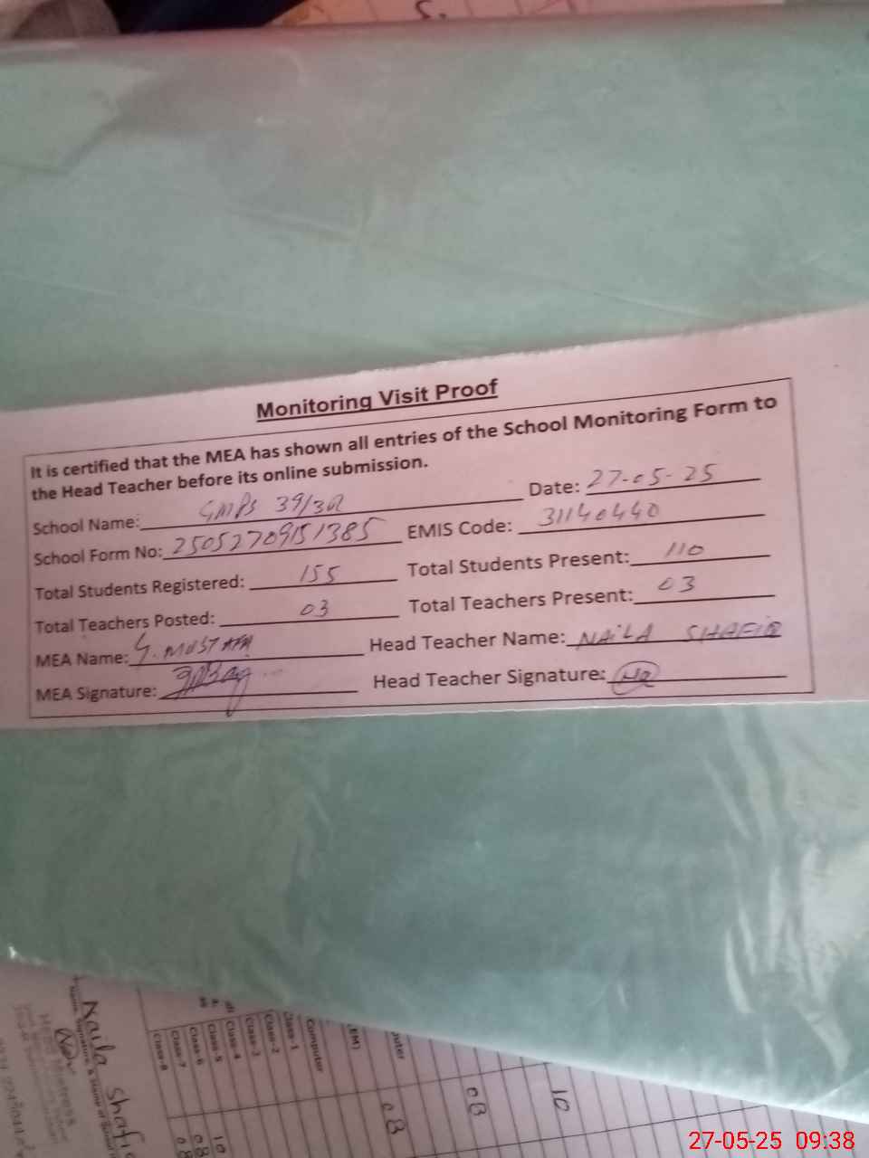 | Attendance Register | Head Teacher | MEA with School | Visit Proof |