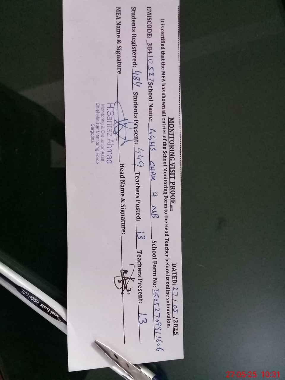 | Attendance Register | Head Teacher | MEA with School | Visit Proof |