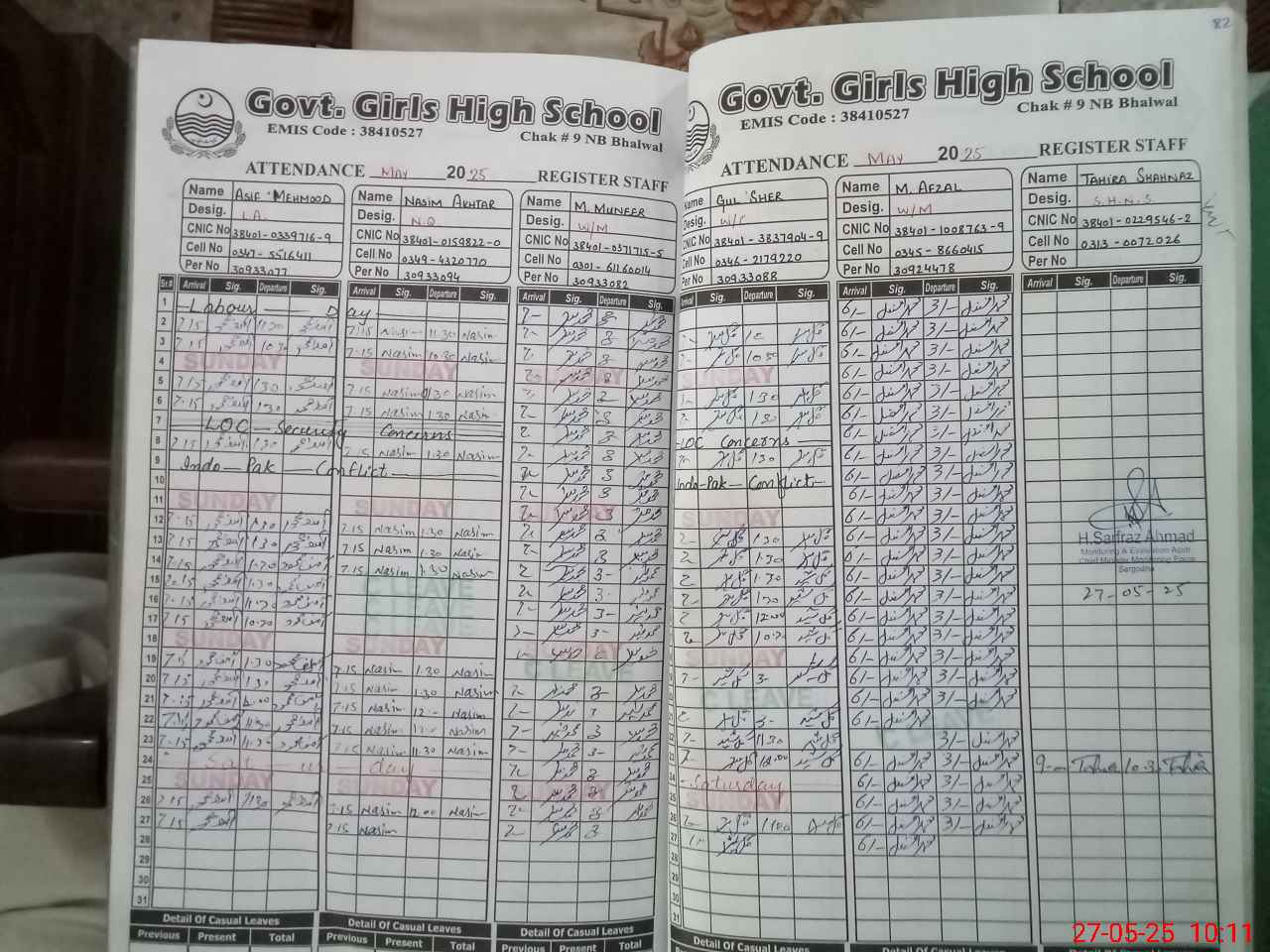 | CNIC | Full Name | Designation | R/C | Absence during last cal. month |