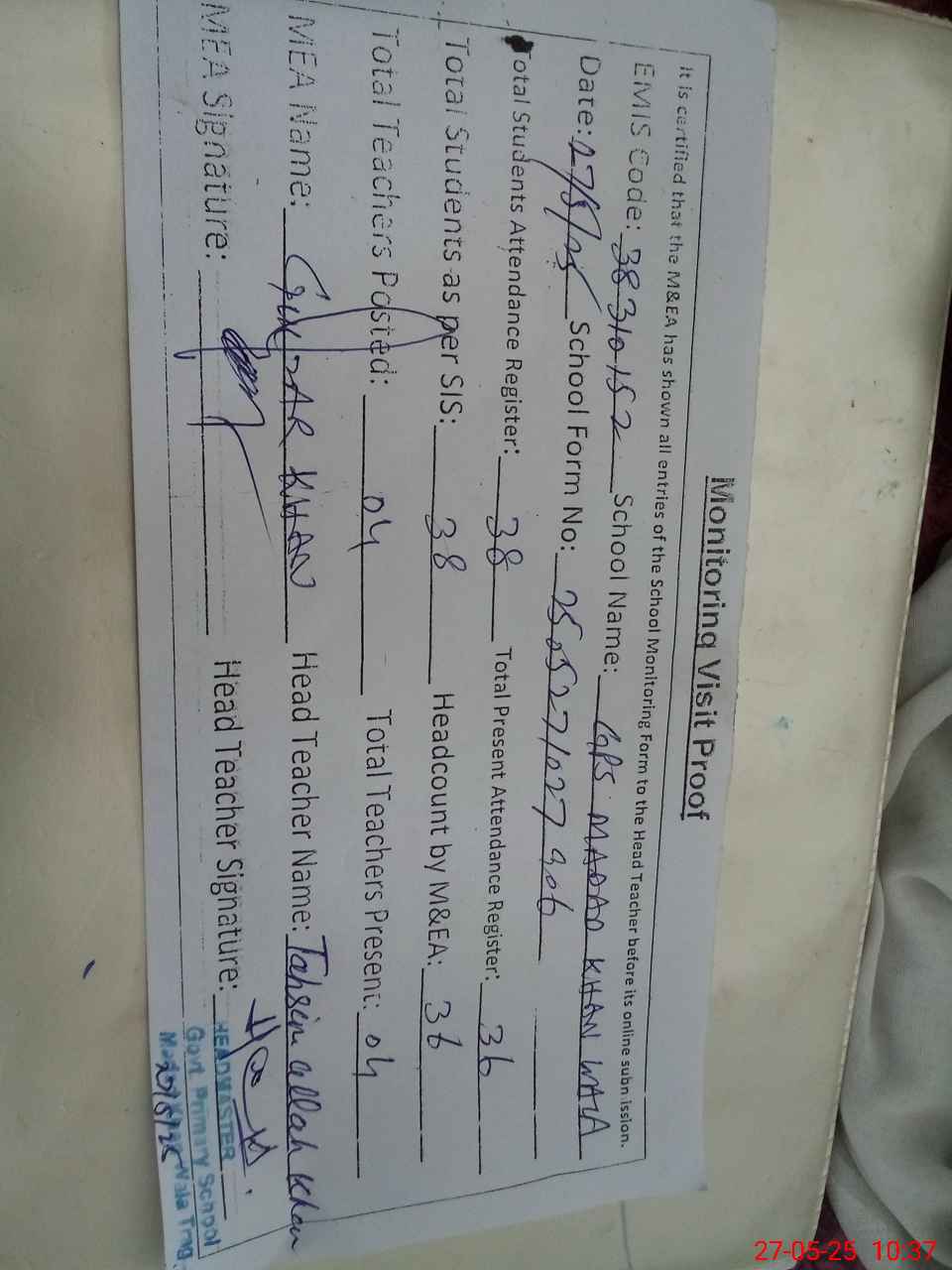 | Attendance Register | Head Teacher | MEA with School | Visit Proof |