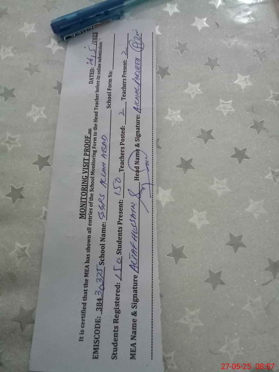 | Attendance Register | Head Teacher | MEA with School | Visit Proof |
