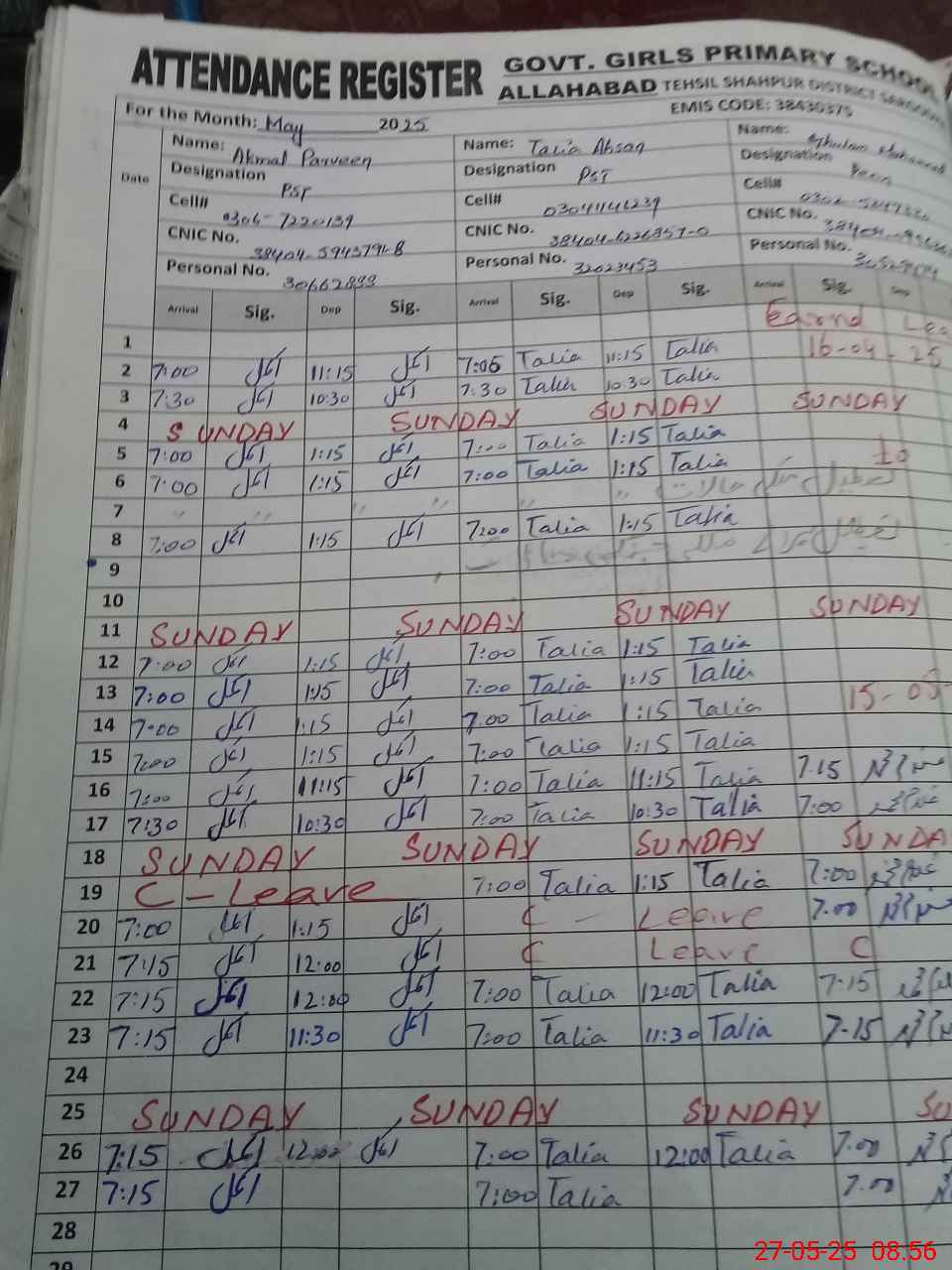 | CNIC | Full Name | Designation | R/C | Absence During Last Calender Month |
