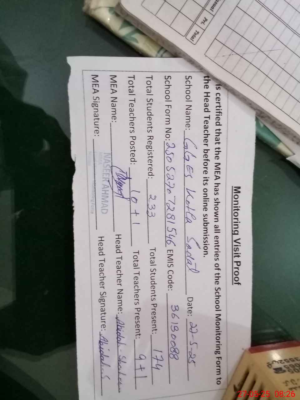 | Attendance Register | Head Teacher | MEA with School | Visit Proof |