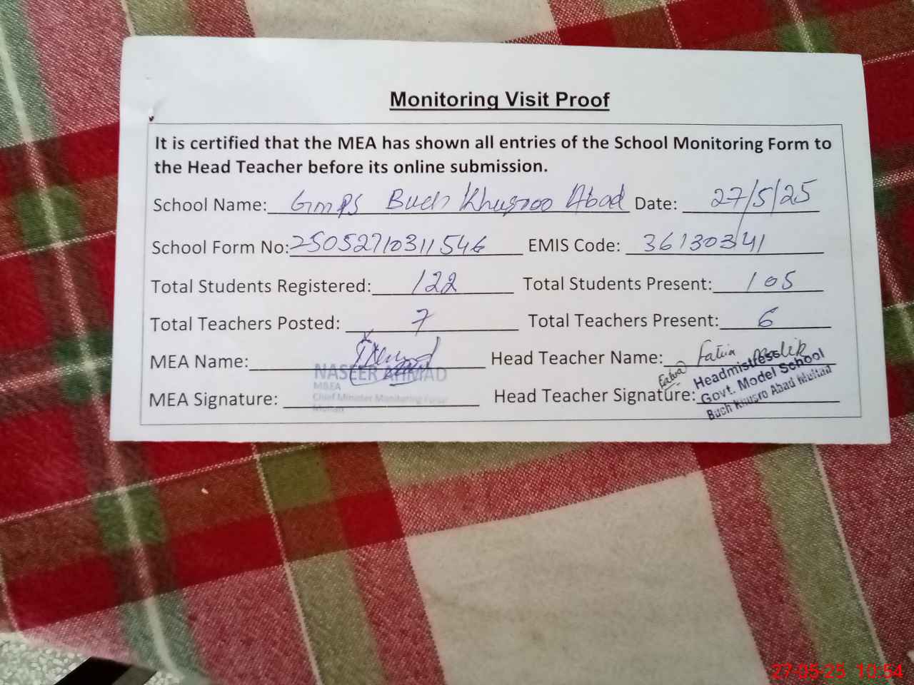 | Attendance Register | Head Teacher | MEA with School | Visit Proof |