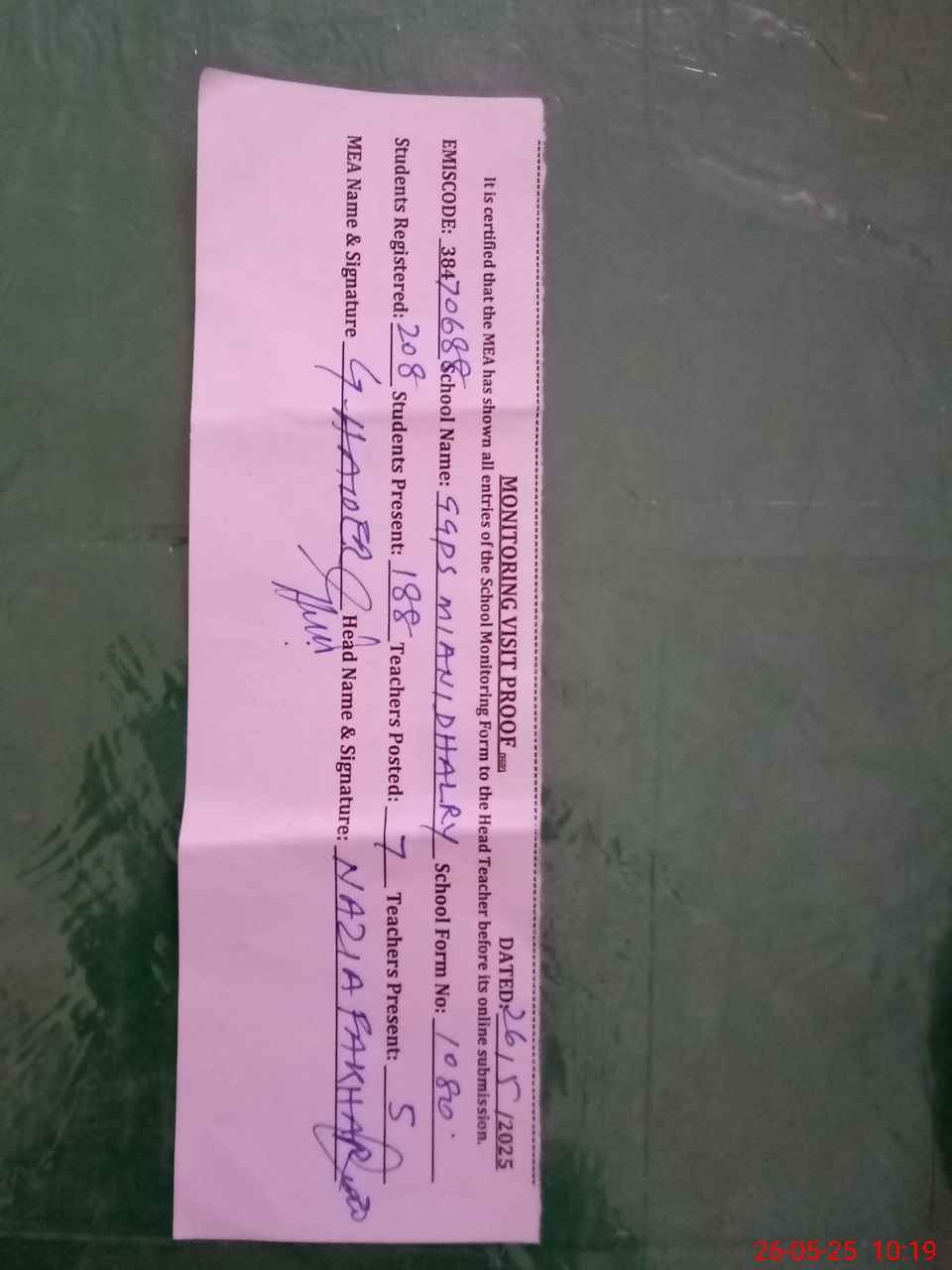 | Certified that this School was Inspected by the Undersigned MEA/DMO Today and the Information Stated Above is as Per Record. | |||||