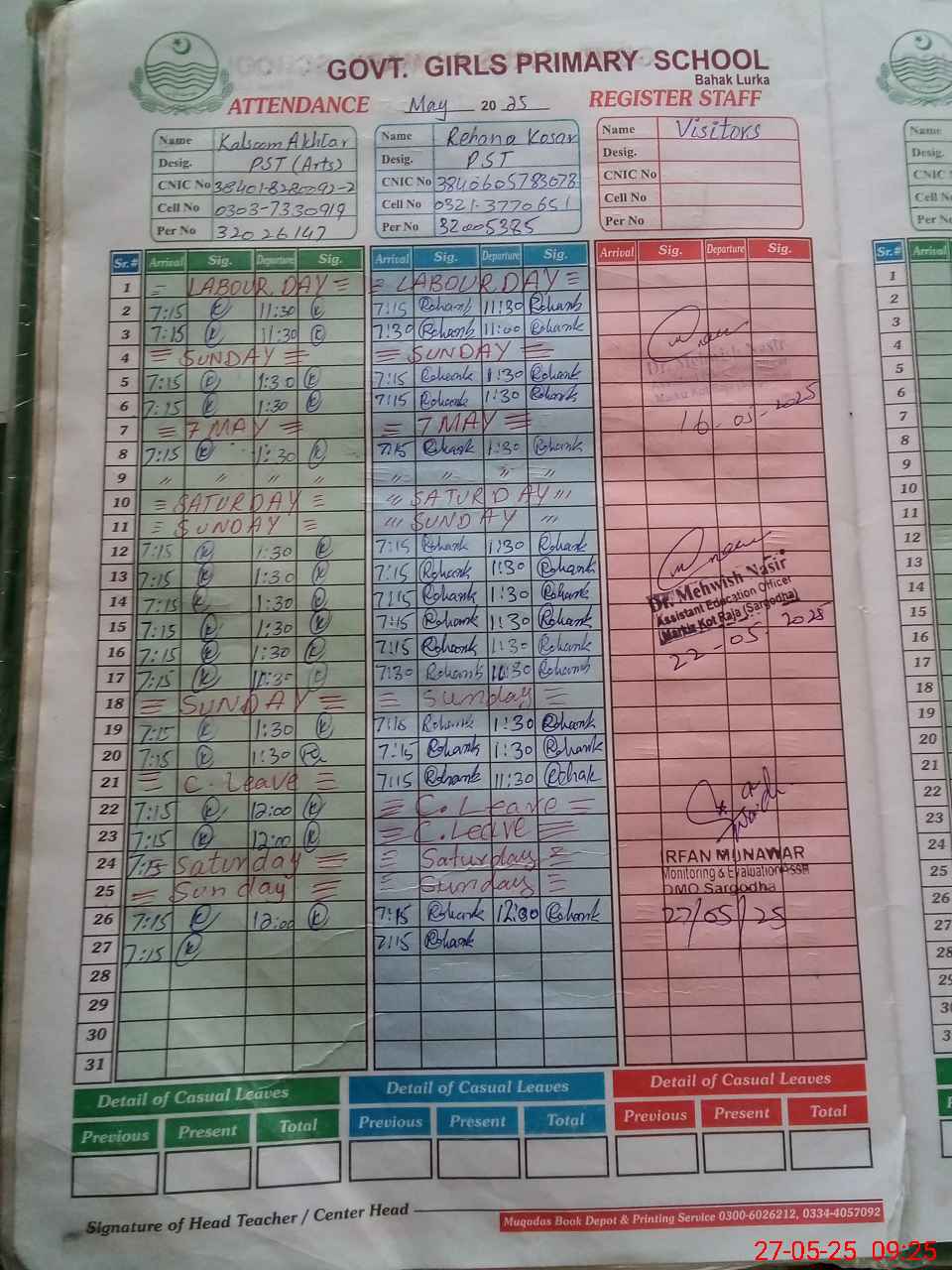 | CNIC | Full Name | Designation | R/C | Absence During Last Calender Month |