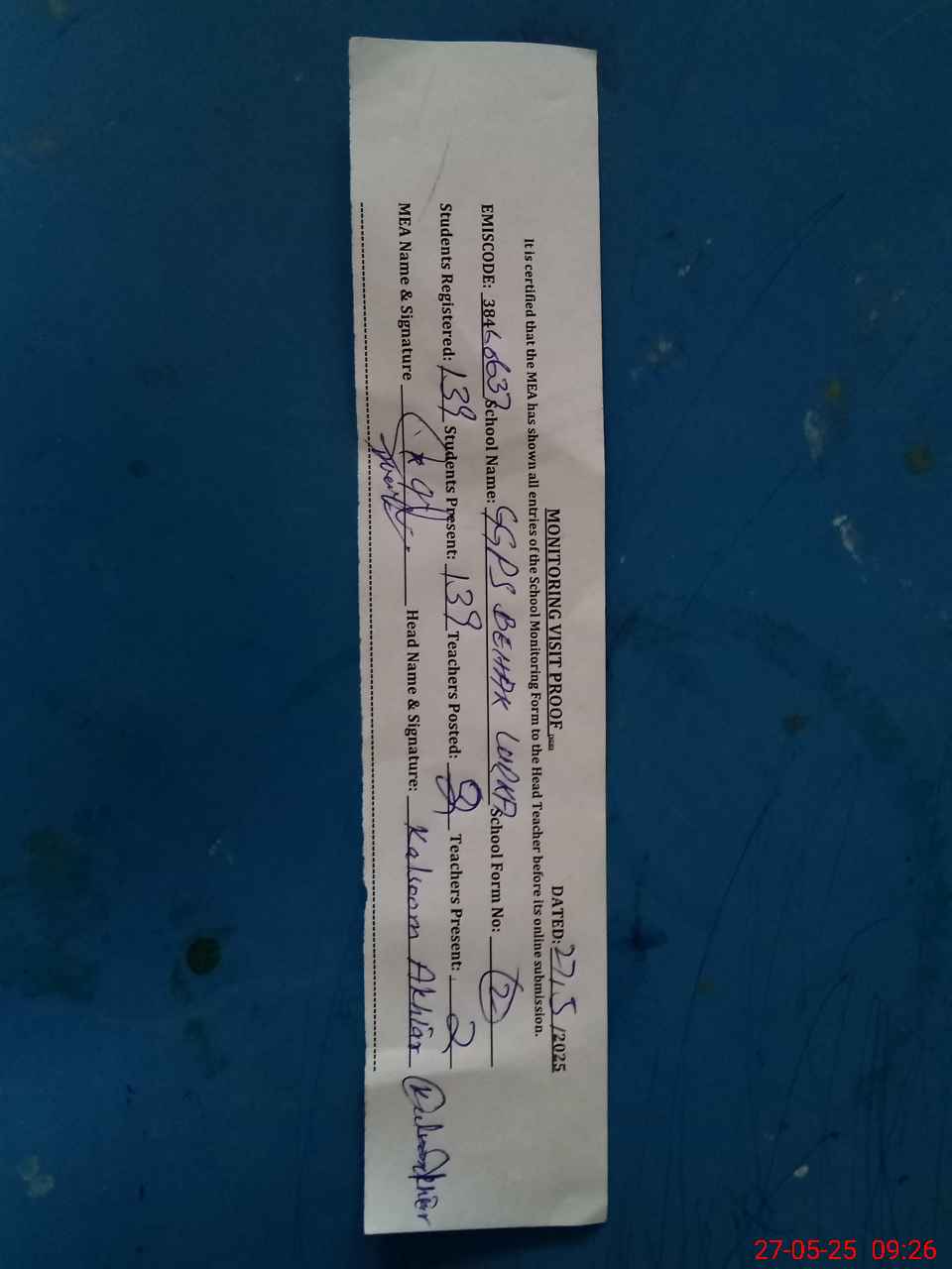 | Attendance Register | Head Teacher | MEA with School | Visit Proof |