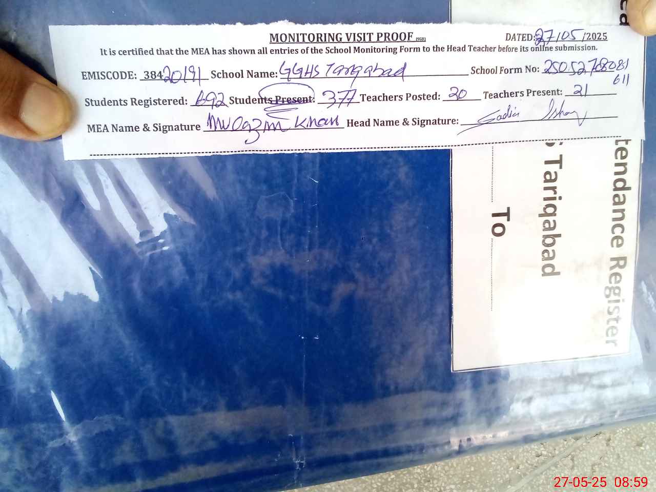| Attendance Register | Head Teacher | MEA with School | Visit Proof |
