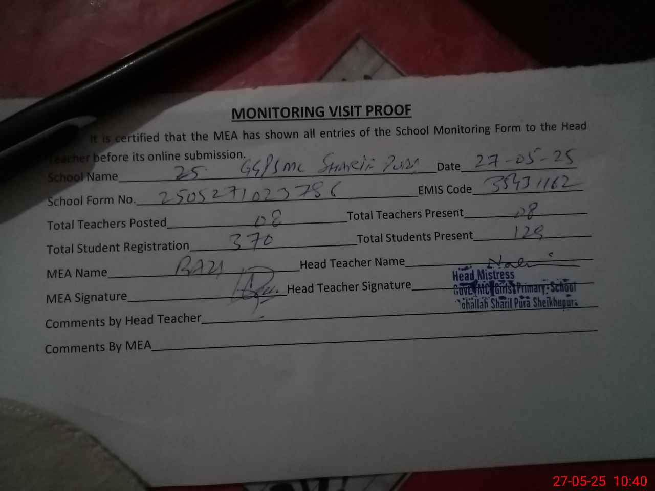 | Attendance Register | Head Teacher | MEA with School | Visit Proof |