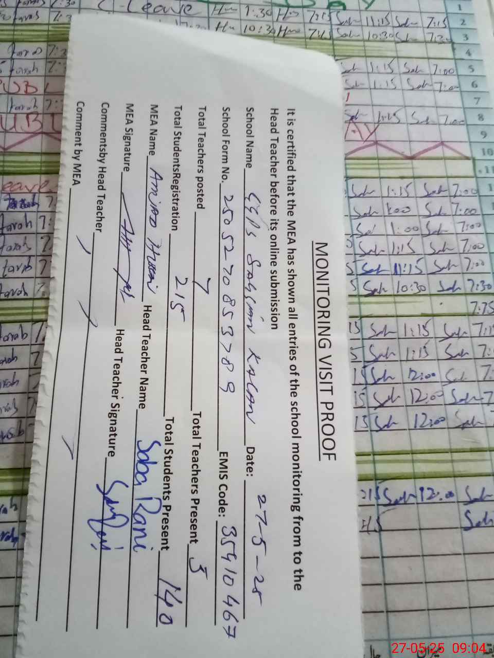 | Attendance Register | Head Teacher | MEA with School | Visit Proof |