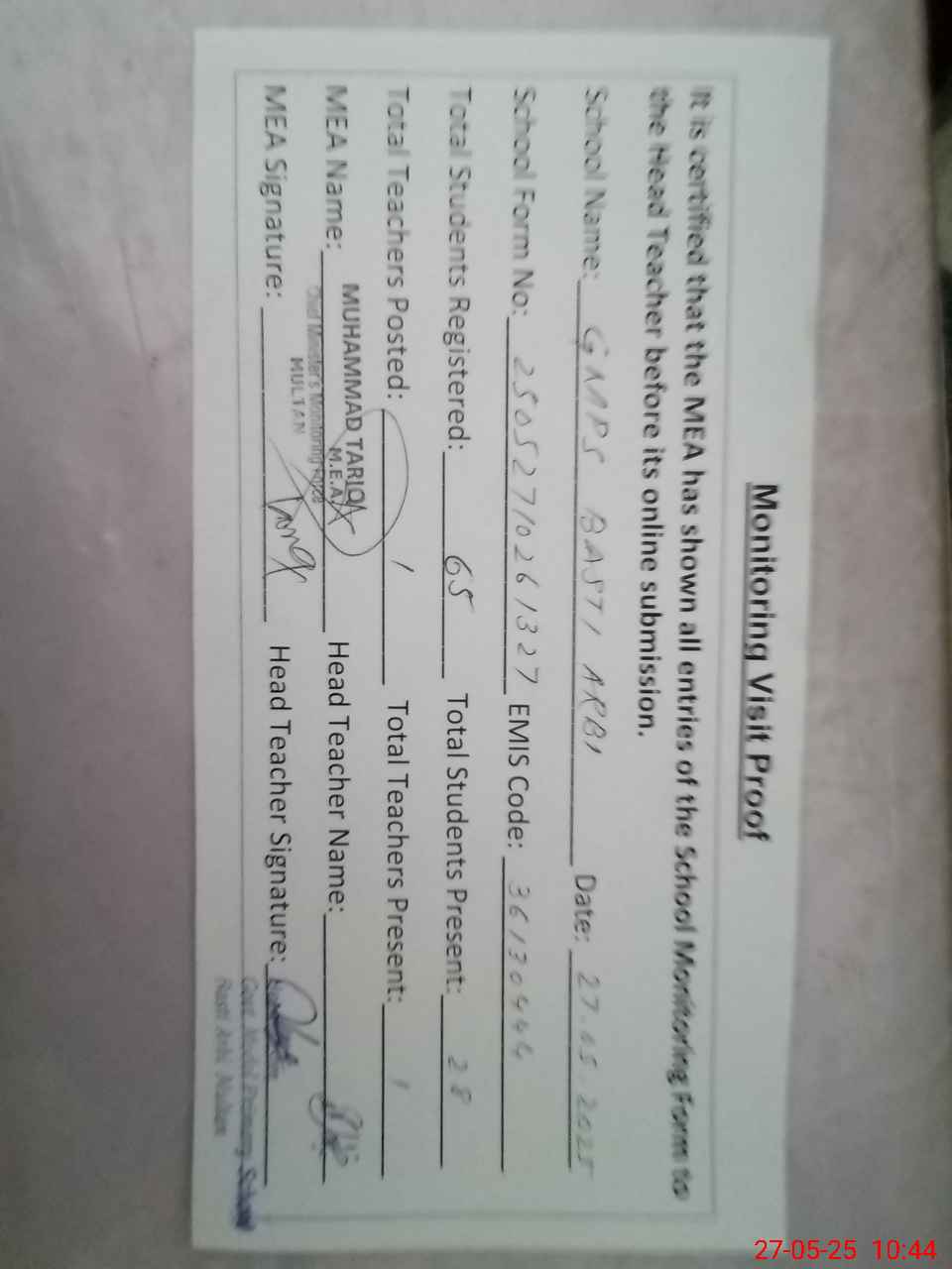 | Attendance Register | Head Teacher | MEA with School | Visit Proof |