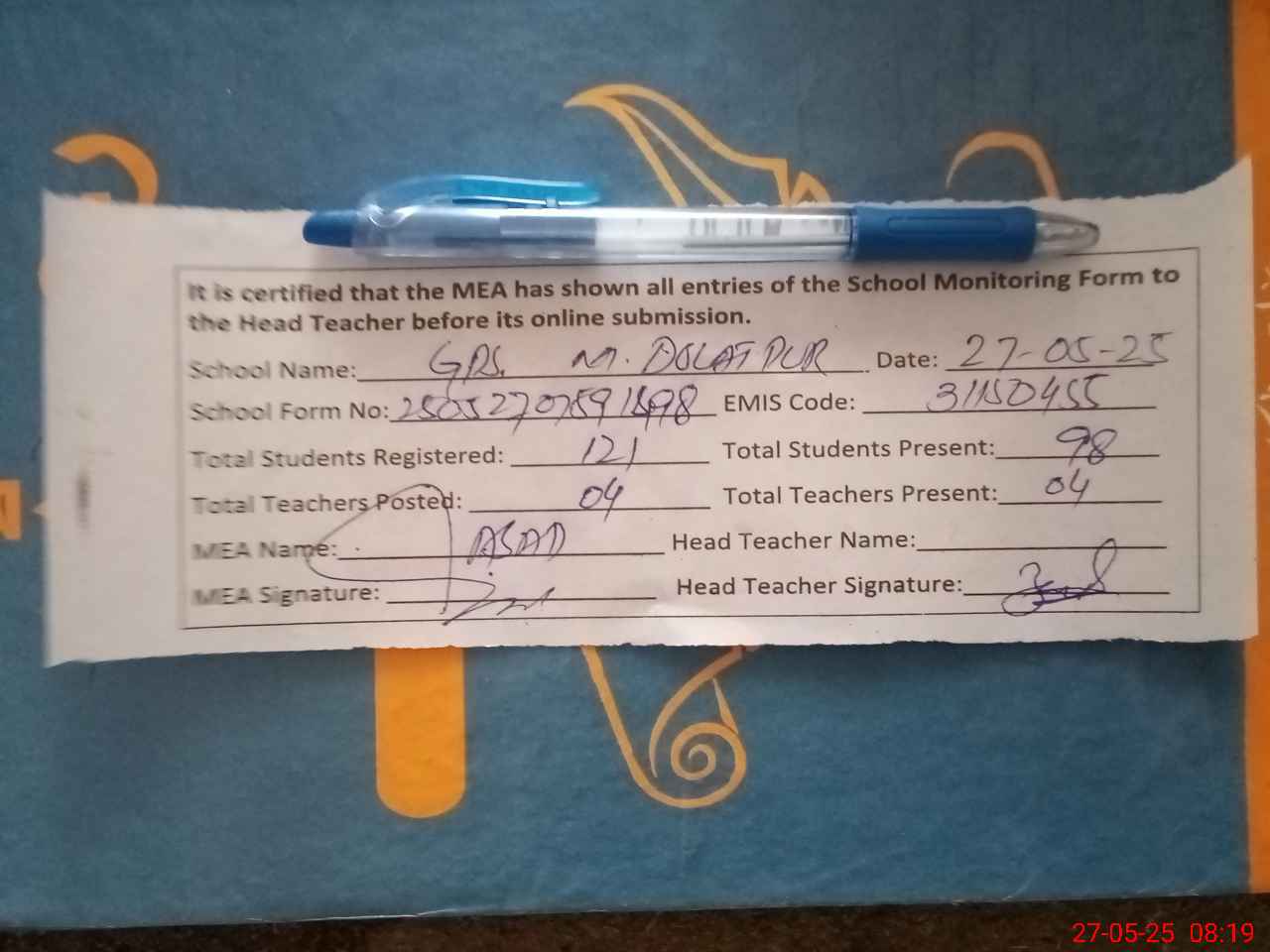 | Attendance Register | Head Teacher | MEA with School | Visit Proof |