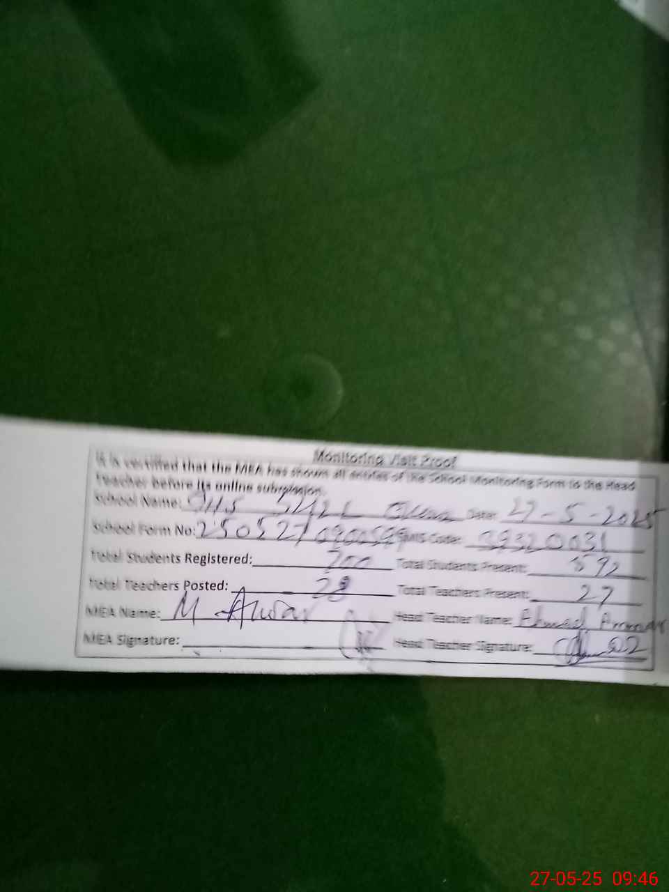 | Attendance Register | Head Teacher | MEA with School | Visit Proof |