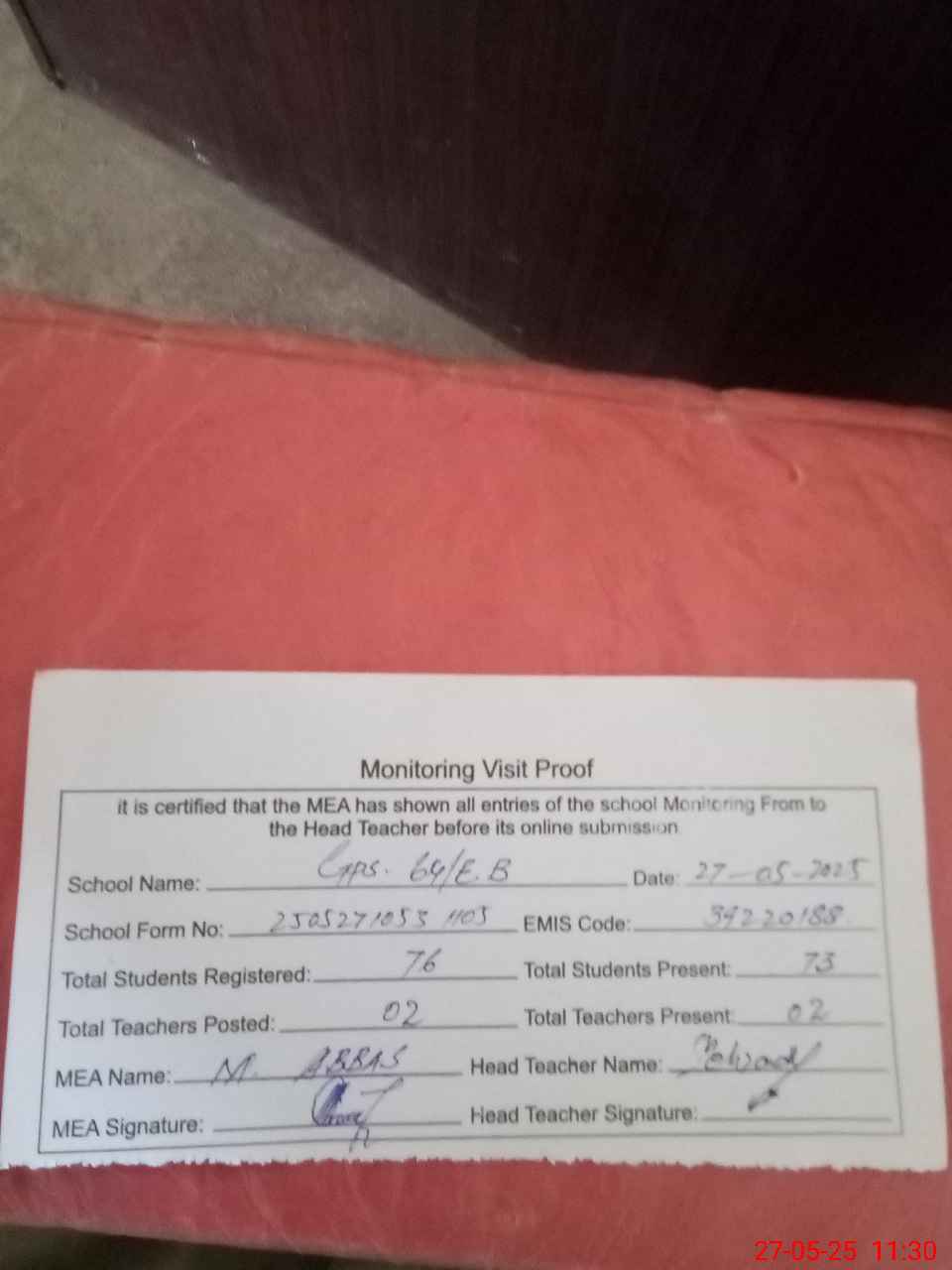 | Attendance Register | Head Teacher | MEA with School | Visit Proof |