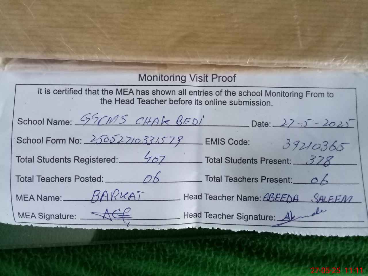 | EMIS Code: 39210365 | Name of School: GGCMS CHAK BEDI | |||