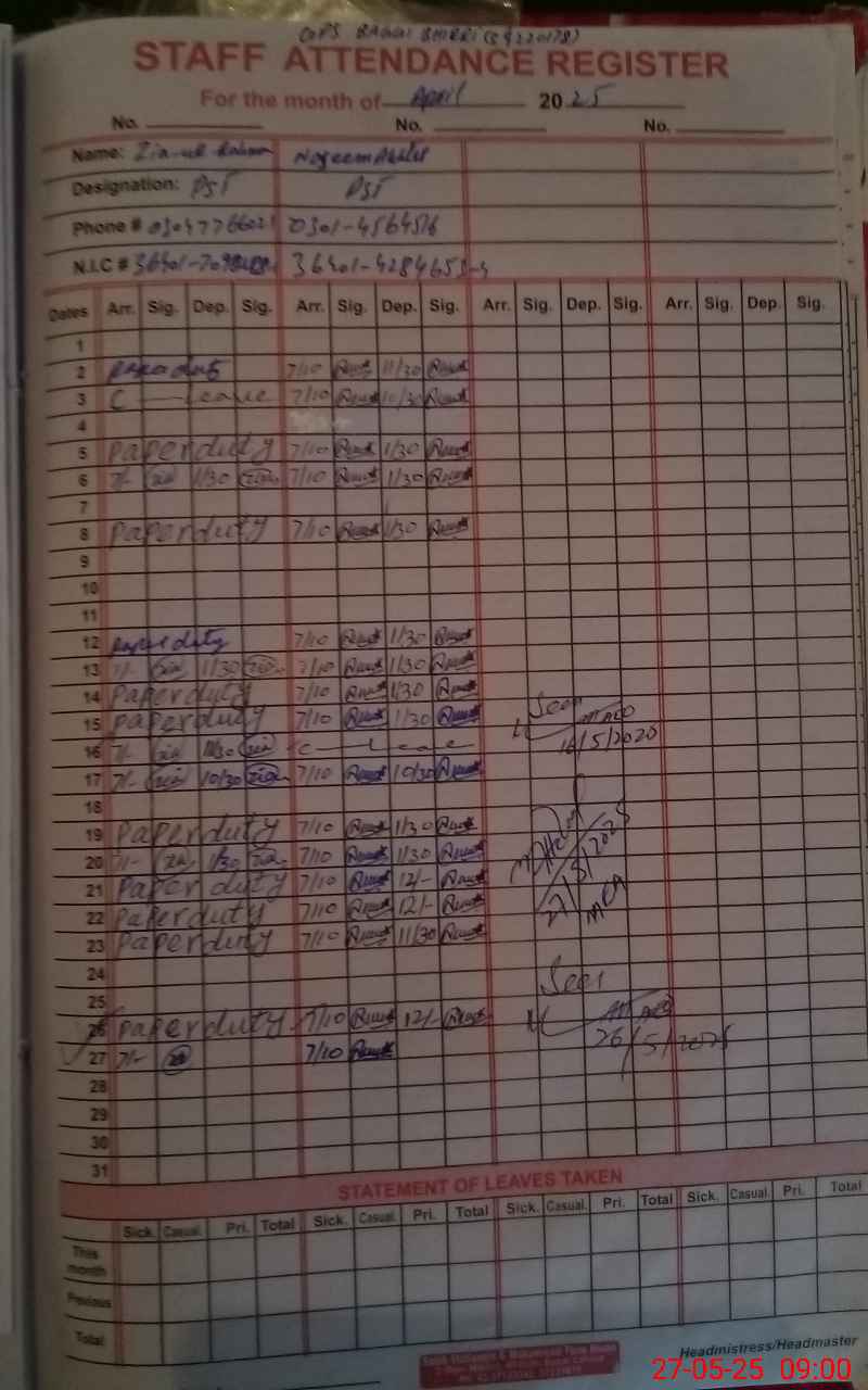 | Name: ZI**** URRE**** Designation: (School Headmaster's/Headmistress's) PST Phone/Cell Number: 03**** |