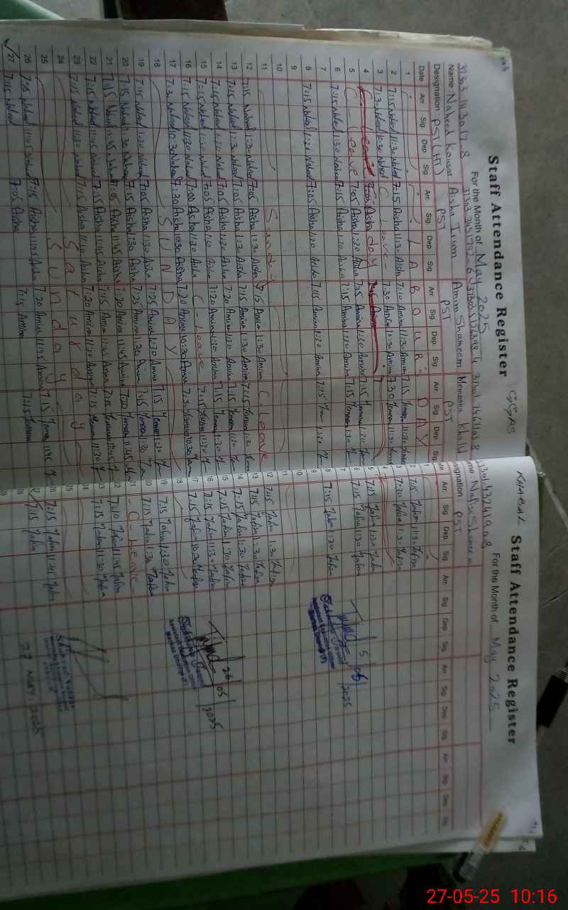 | CNIC | Full Name | Designation | R/C | Absence During Last Calender Month |