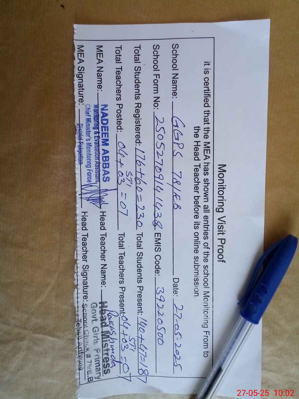 | EMIS Code: 39220500 | Name of School: GGES CHAK NO.78 EB | |||