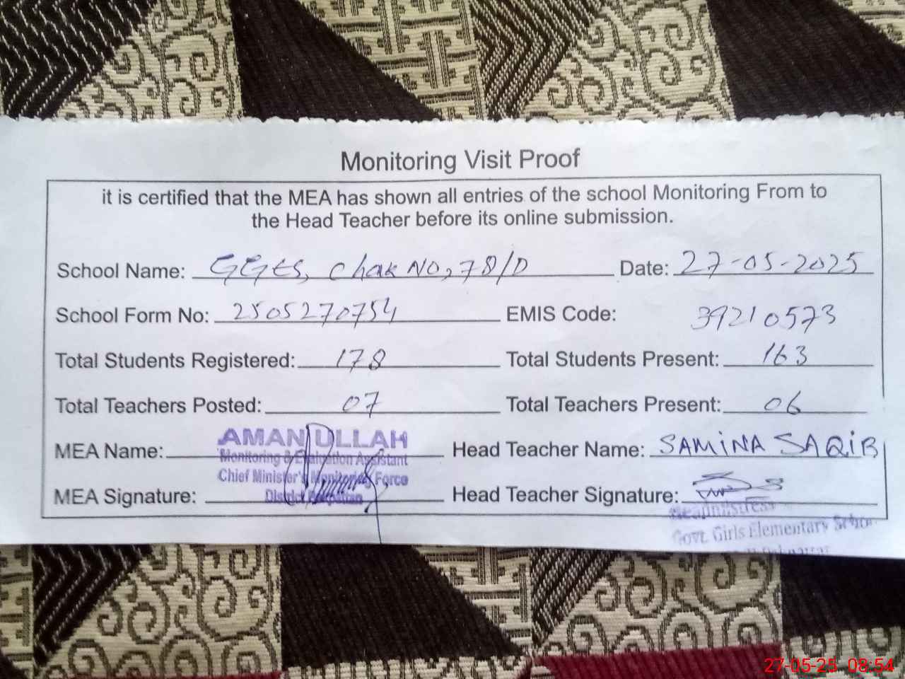 | Attendance Register | Head Teacher | MEA with School | Visit Proof |