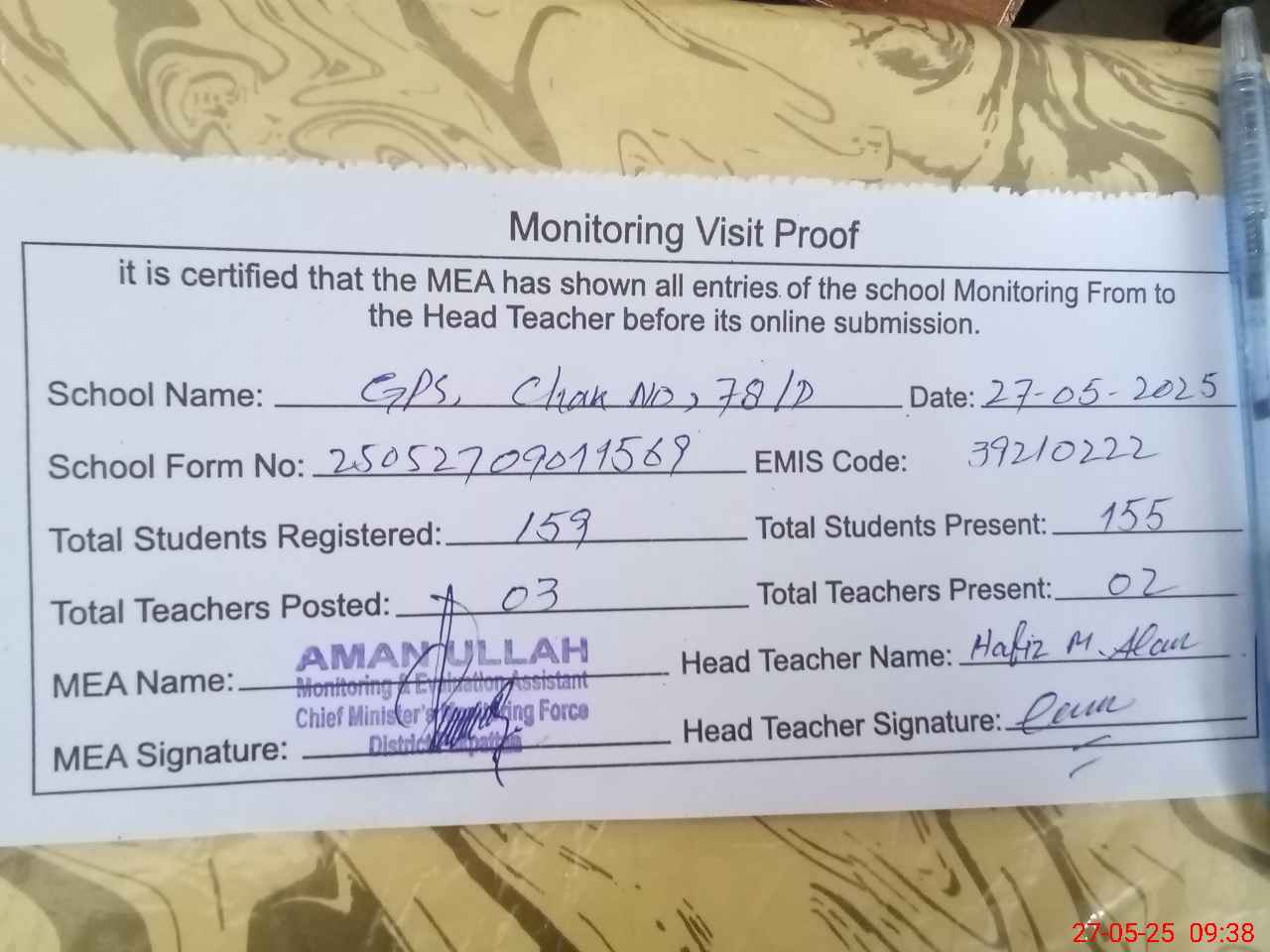 | EMIS Code: 39210222 | Name of School: GPS CHAK NO. 78/D | |||