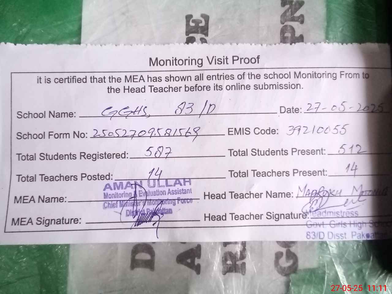 | Attendance Register | Head Teacher | MEA with School | Visit Proof |