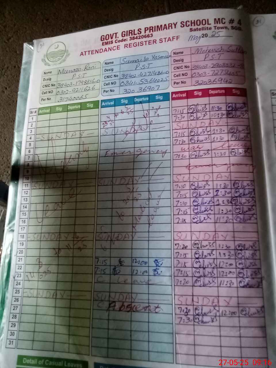 | CNIC | Full Name | Designation | R/C | Absence During Last Calender Month |