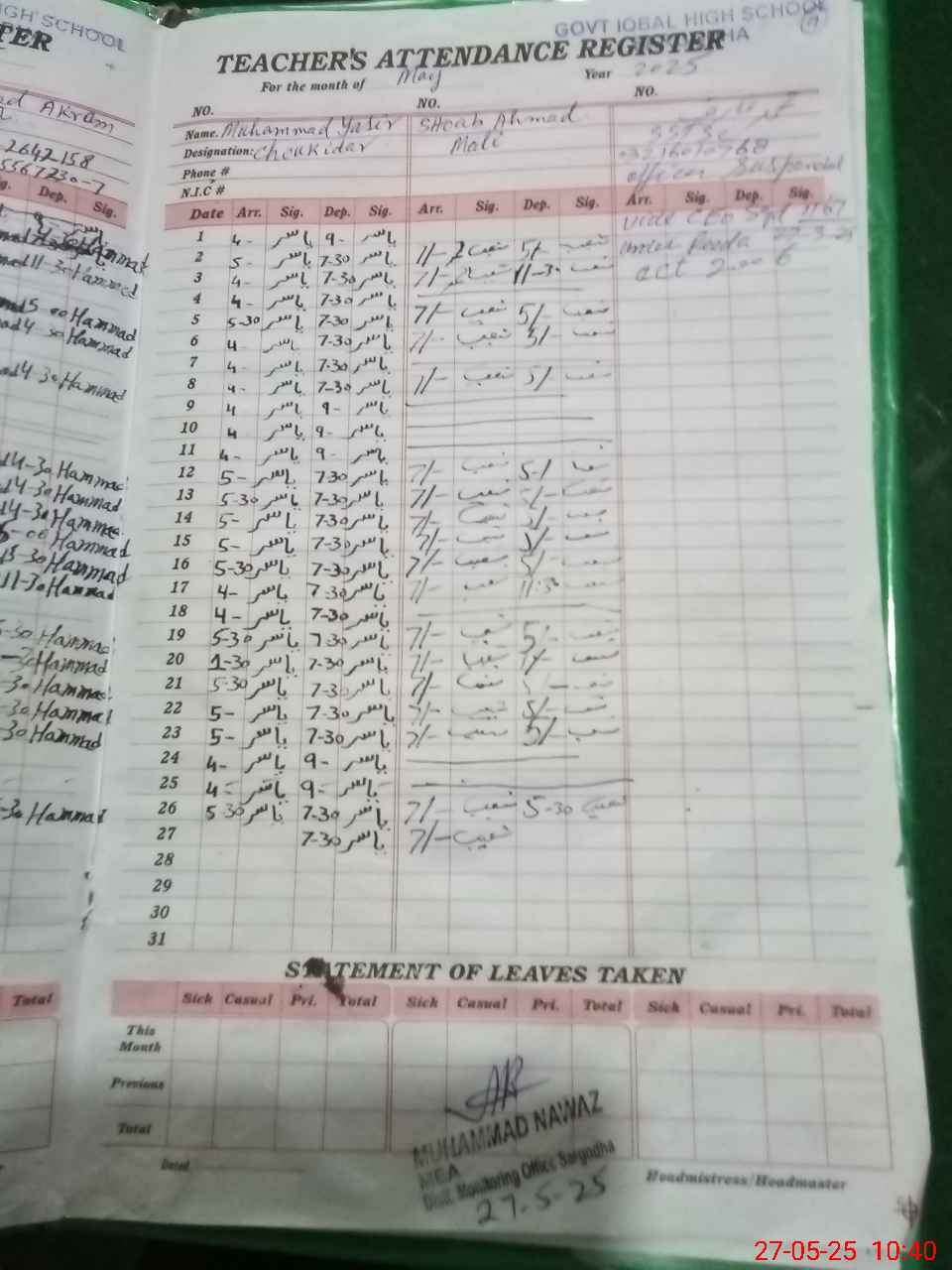 | Name: IJ**** AH**** CH**** Designation: (School Headmaster's/Headmistress's) H M Phone/Cell Number: 03**** |