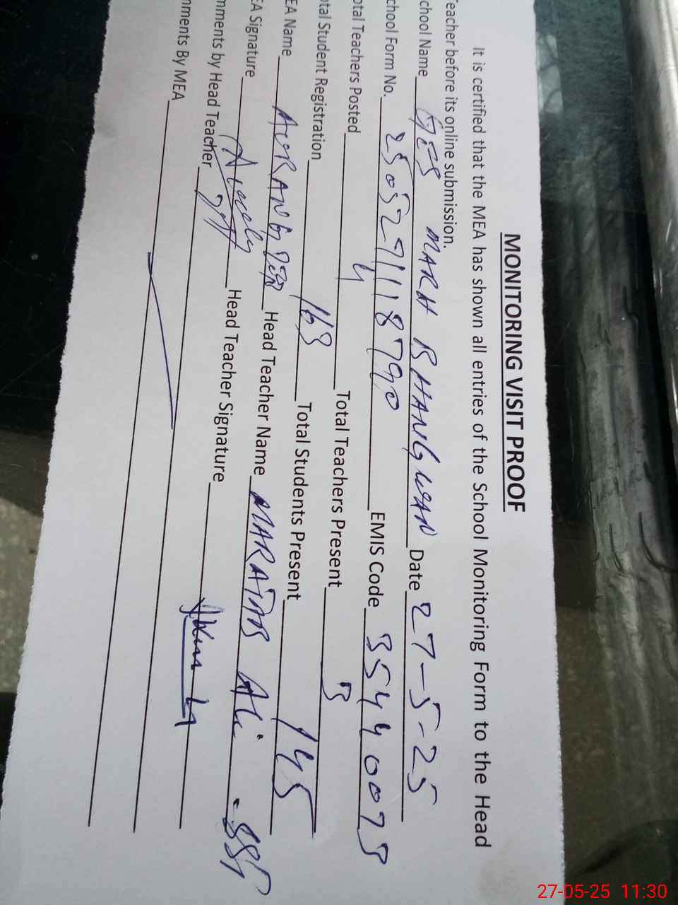 | Attendance Register | Head Teacher | MEA with School | Visit Proof |