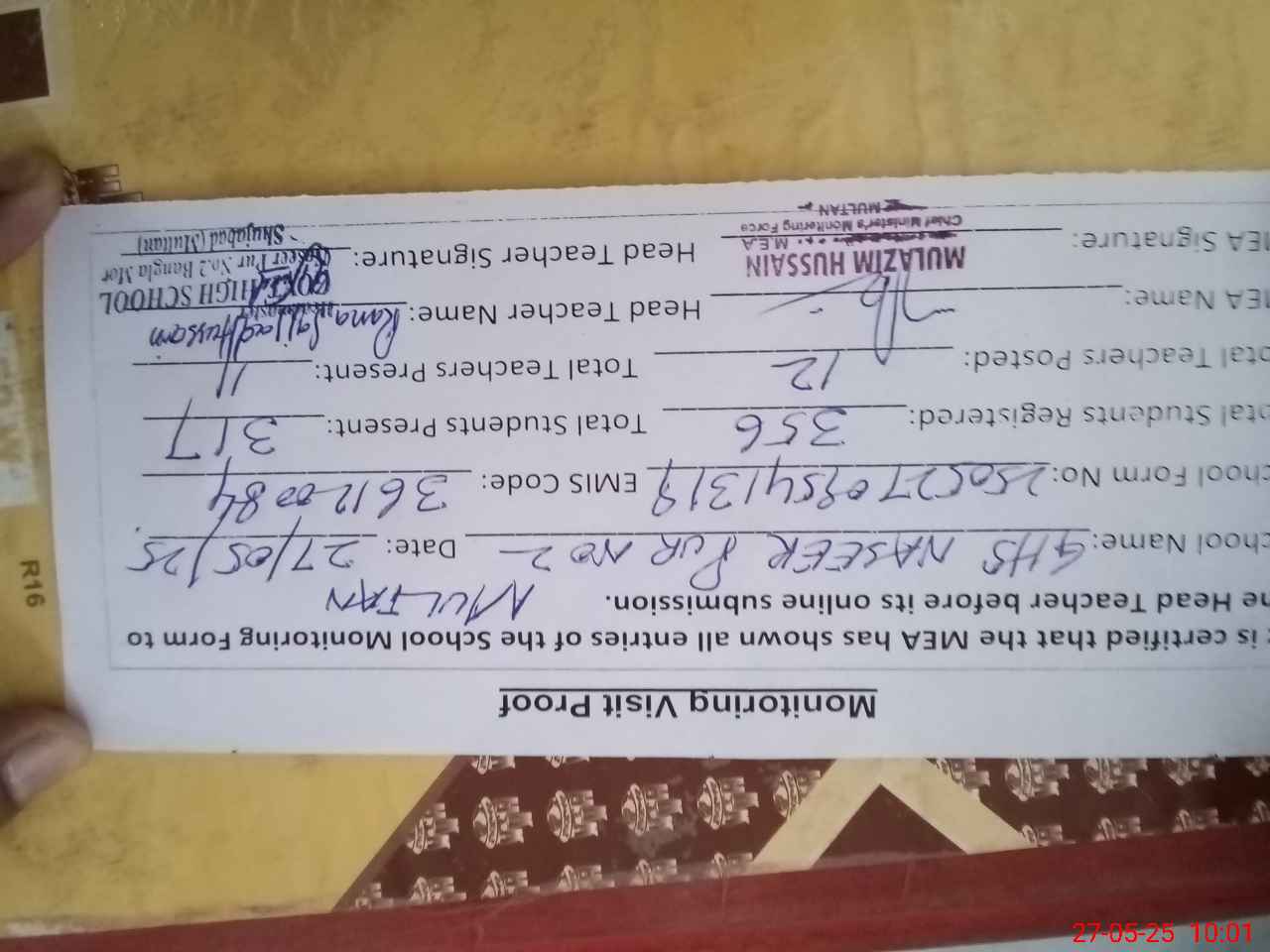 | Attendance Register | Head Teacher | MEA with School | Visit Proof |