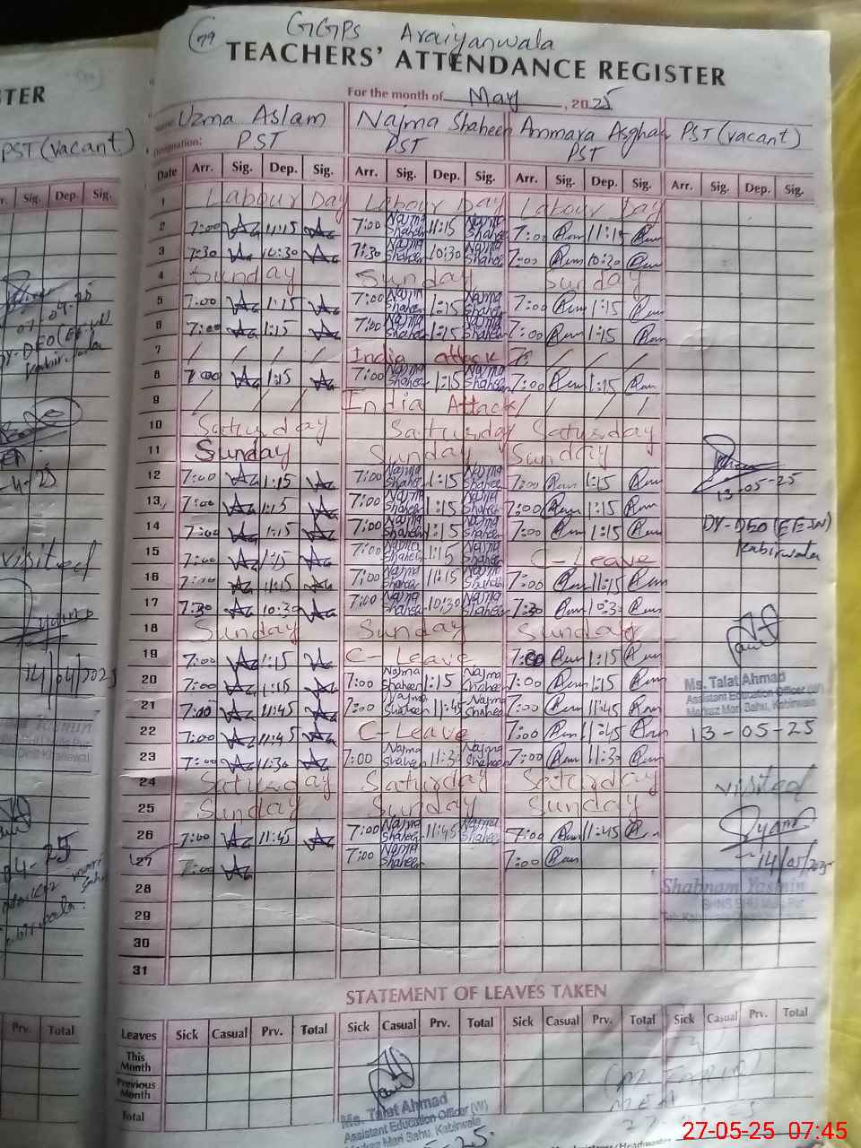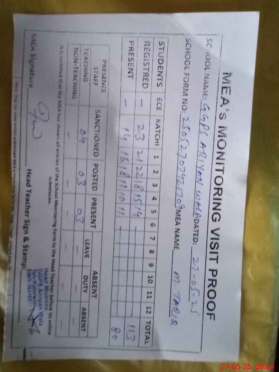 | Attendance Register | Head Teacher | MEA with School | Visit Proof |