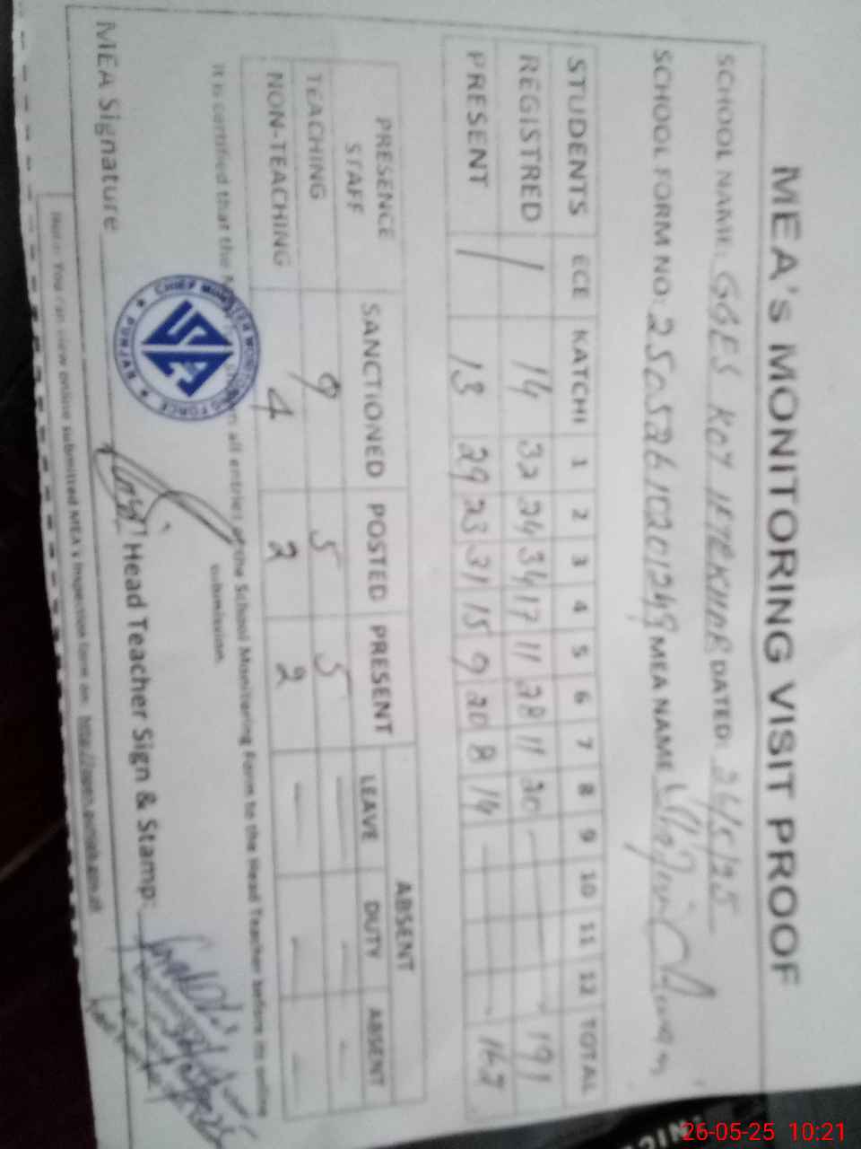 | Attendance Register | Head Teacher | MEA with School | Visit Proof |