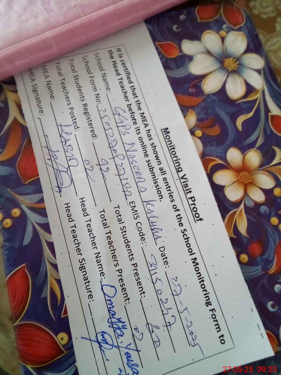 | Attendance Register | Head Teacher | MEA with School | Visit Proof |