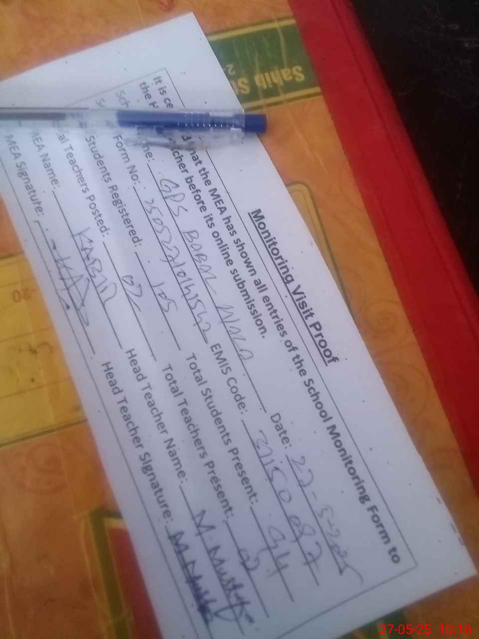 | Attendance Register | Head Teacher | MEA with School | Visit Proof |