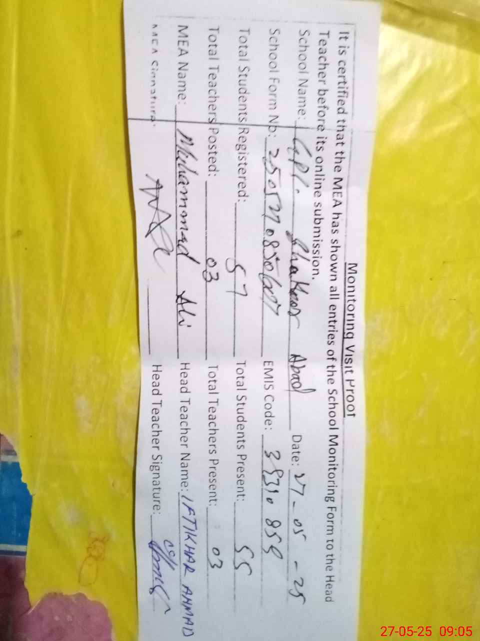| Attendance Register | Head Teacher | MEA with School | Visit Proof |