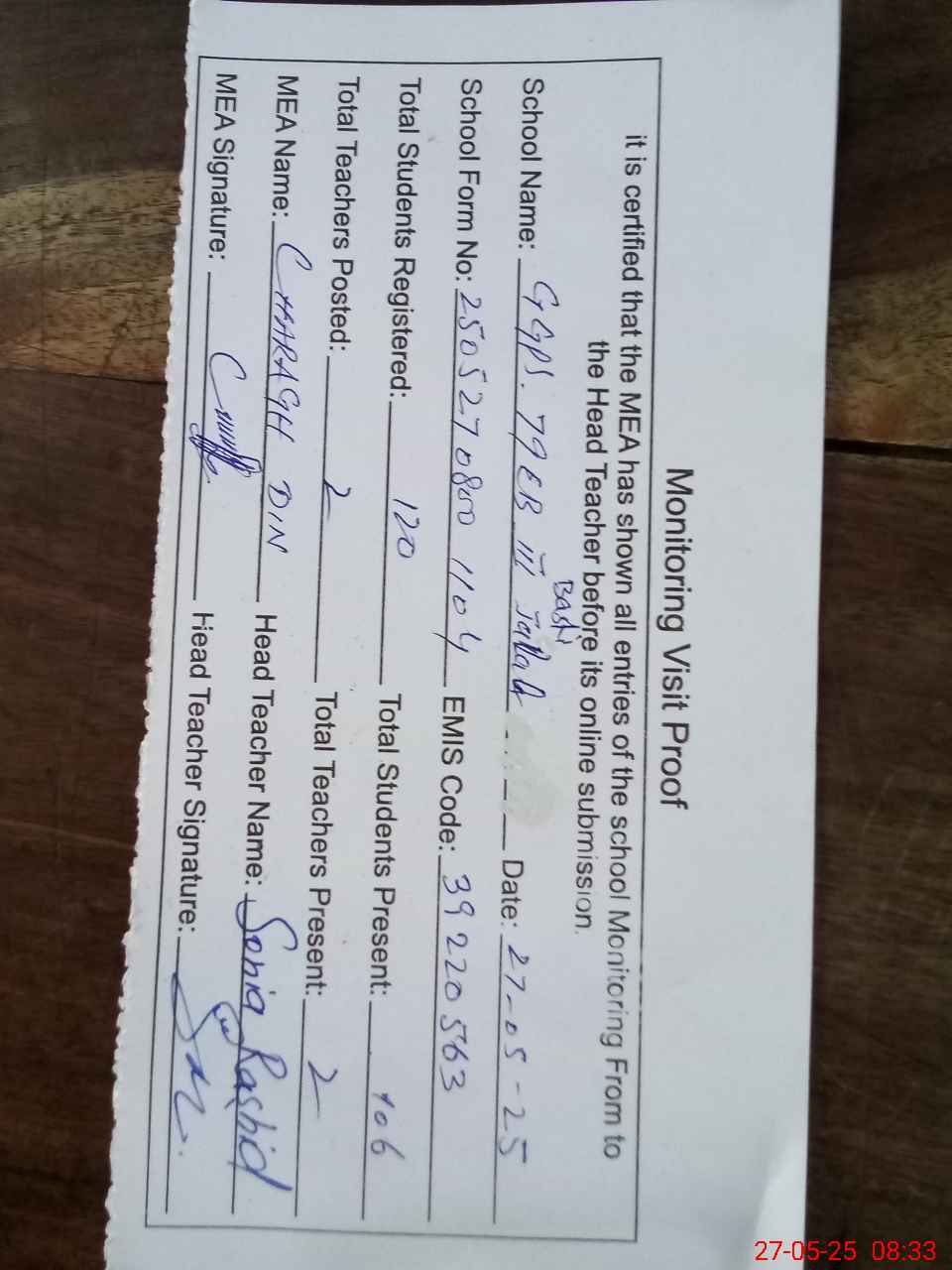 | Attendance Register | Head Teacher | MEA with School | Visit Proof |