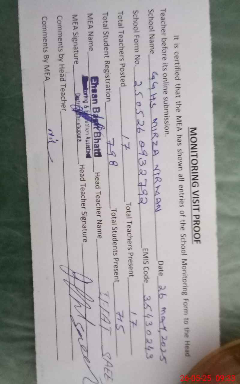 | Attendance Register | Head Teacher | MEA with School | Visit Proof |