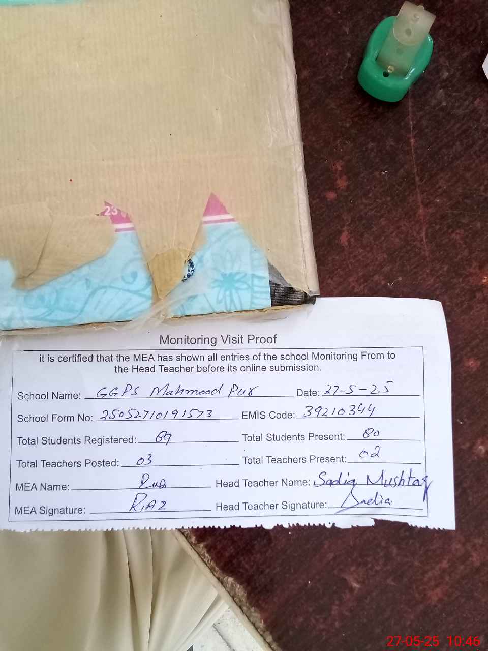 | Attendance Register | Head Teacher | MEA with School | Visit Proof |