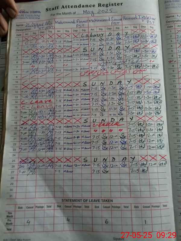 | CNIC | Full Name | Designation | R/C | Absence During Last Calender Month |