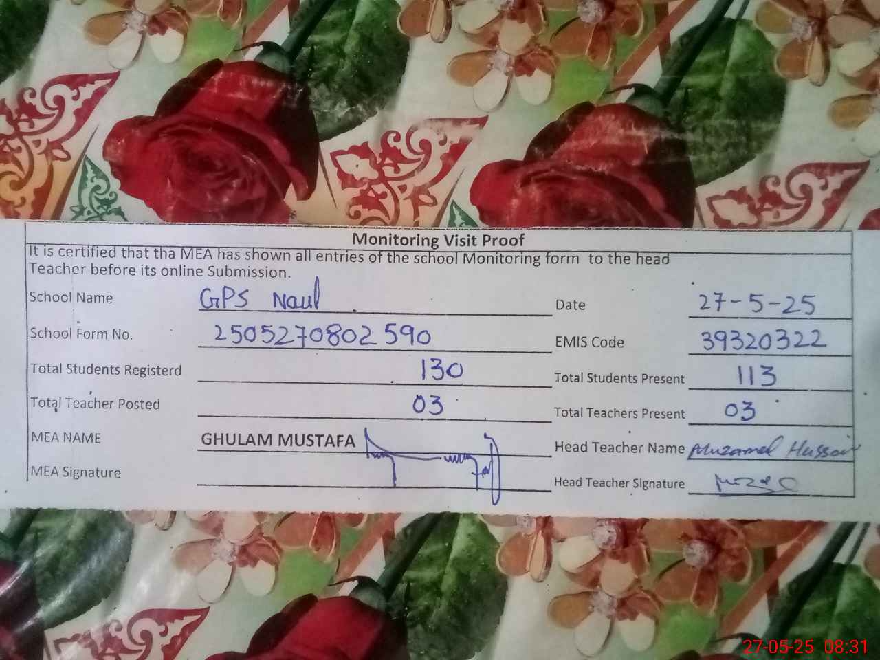 | Attendance Register | Head Teacher | MEA with School | Visit Proof |