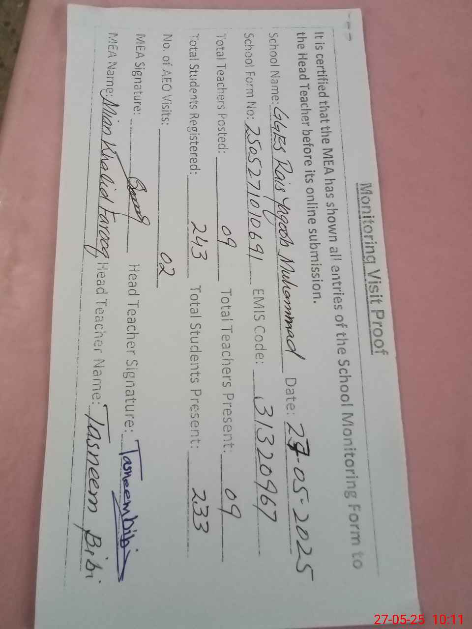 | Attendance Register | Head Teacher | MEA with School | Visit Proof |