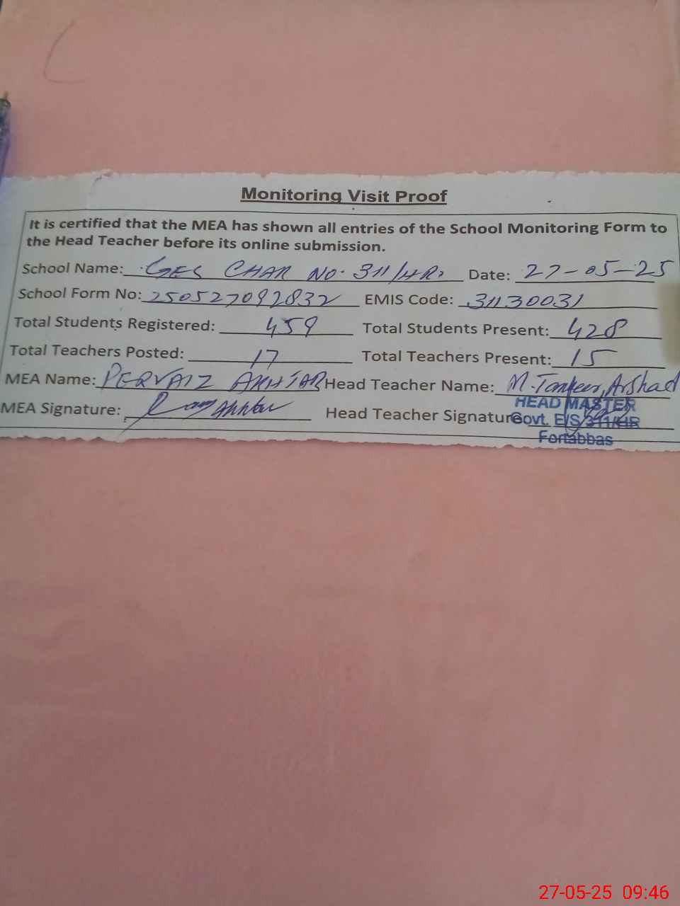 | Attendance Register | Head Teacher | MEA with School | Visit Proof |
