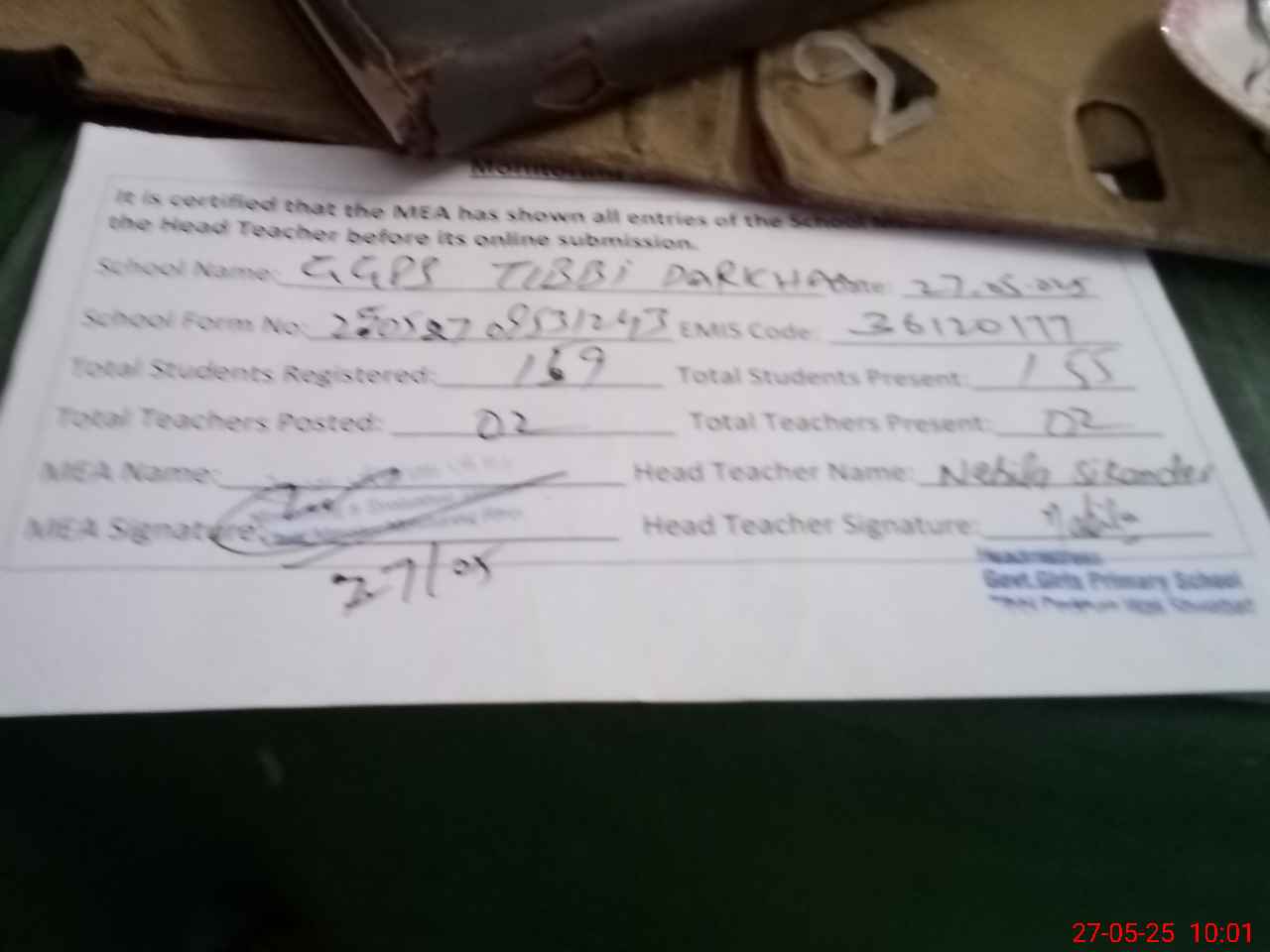| Attendance Register | Head Teacher | MEA with School | Visit Proof |