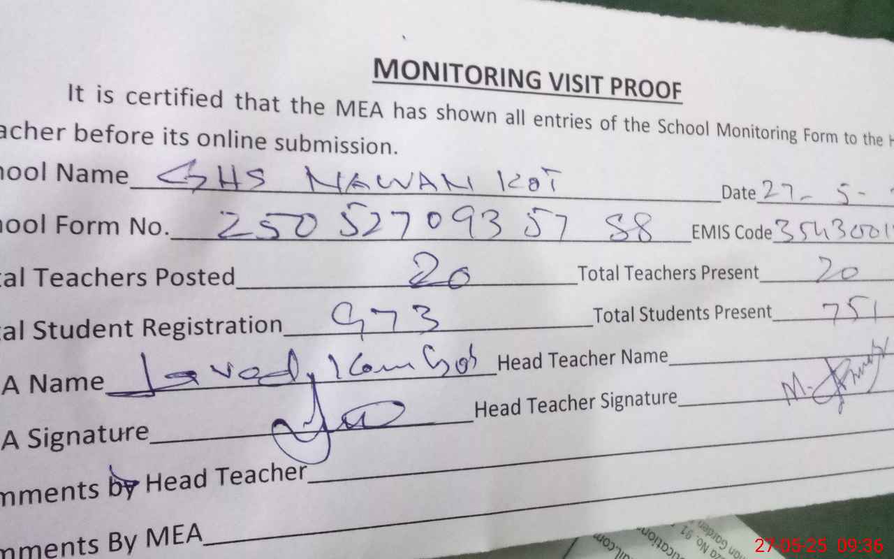 | Attendance Register | Head Teacher | MEA with School | Visit Proof |